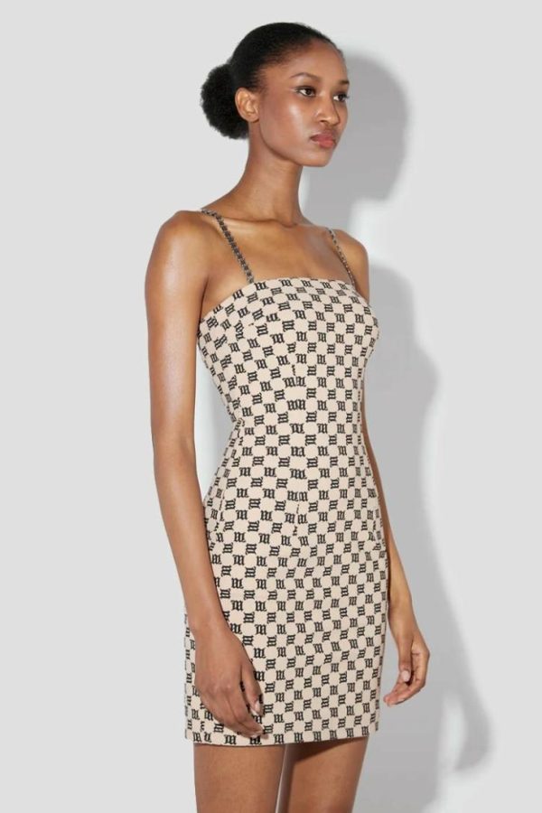 Beige mini dress crafted from stretchy fabric. Features an all-over monogram pattern. Detachable and adjustable metal shoulder straps. Elastic lining. Fastened at the back with a zipper.