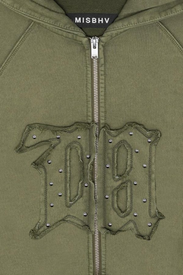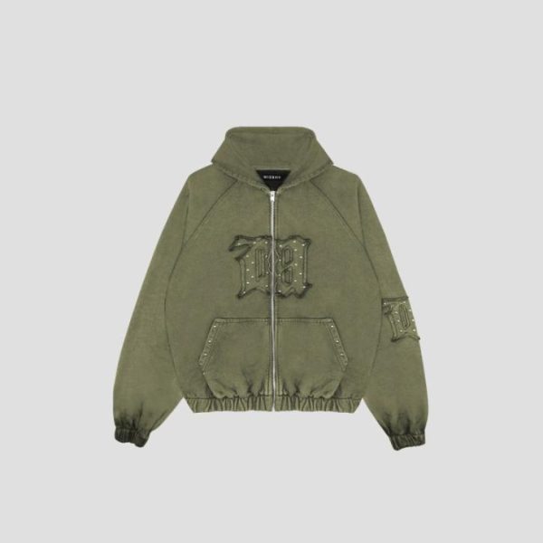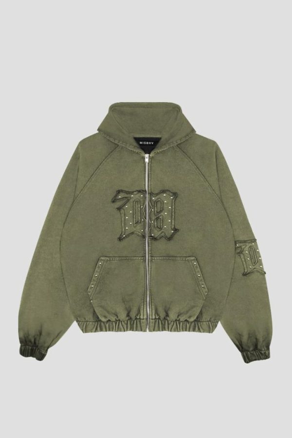 Heavyweight french terry zipped hoodie in olive. Fading throughout.