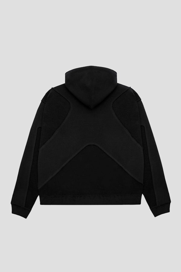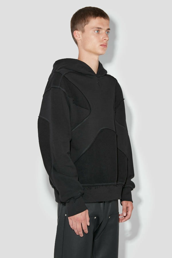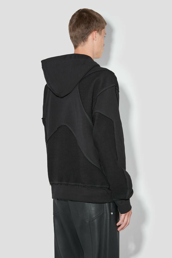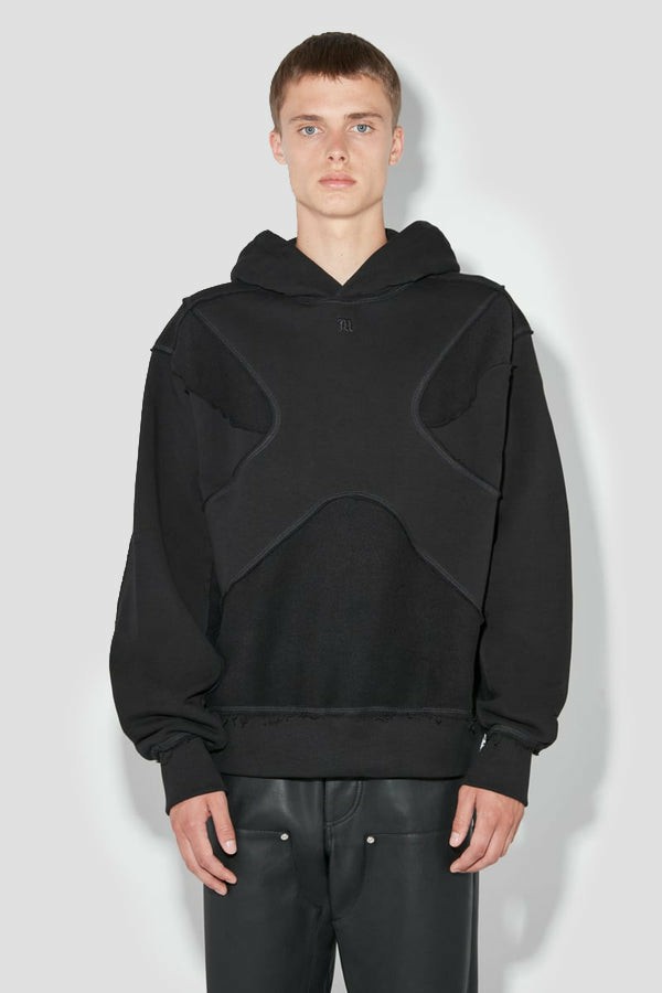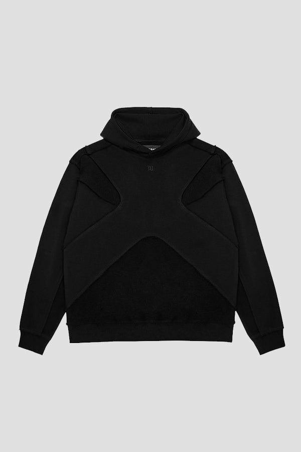 Hoodie in black color. Rough visible stitching and big “X” shaped cuts at front and back. Features tonal embroidery on the central part.
