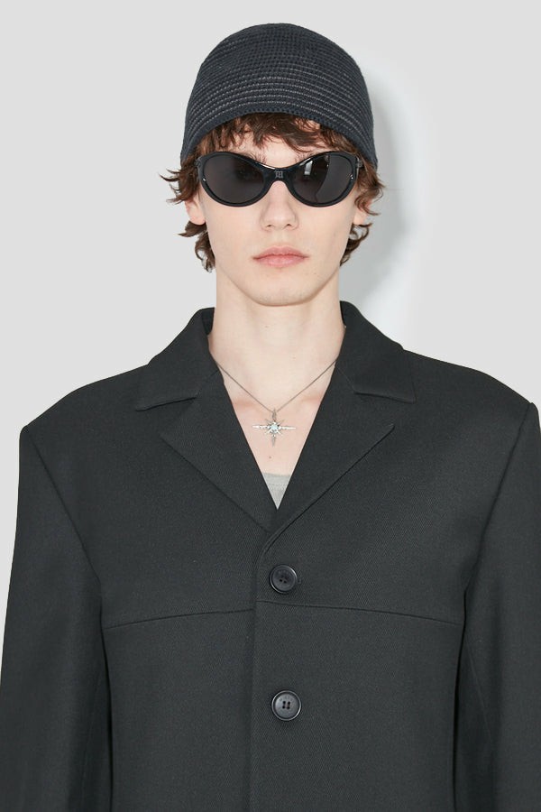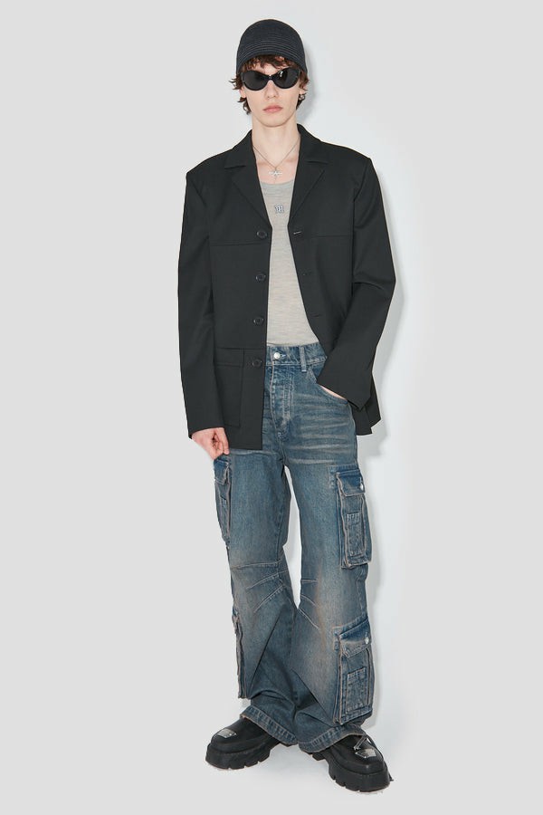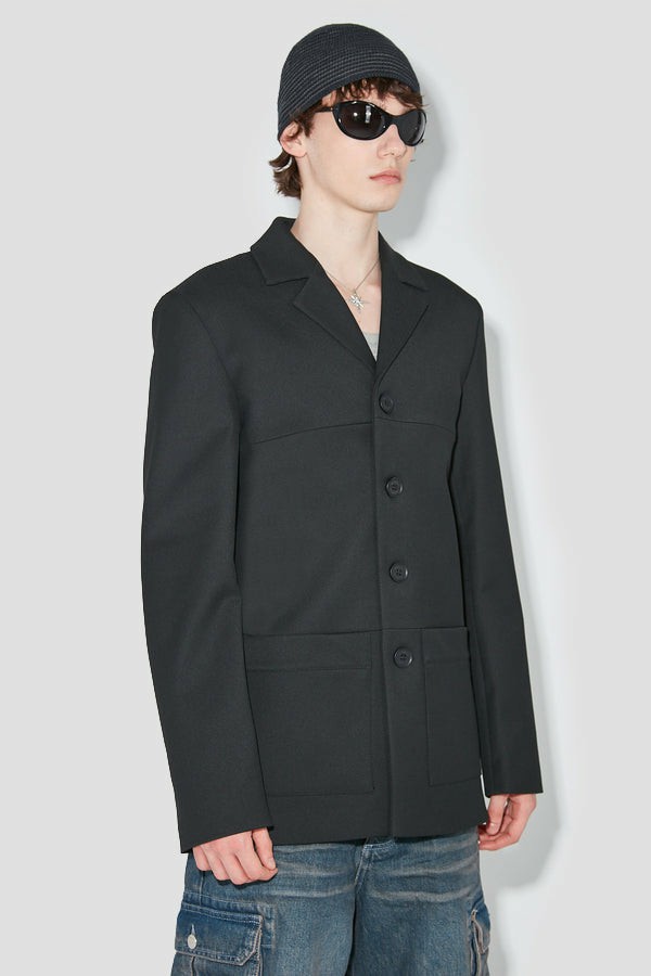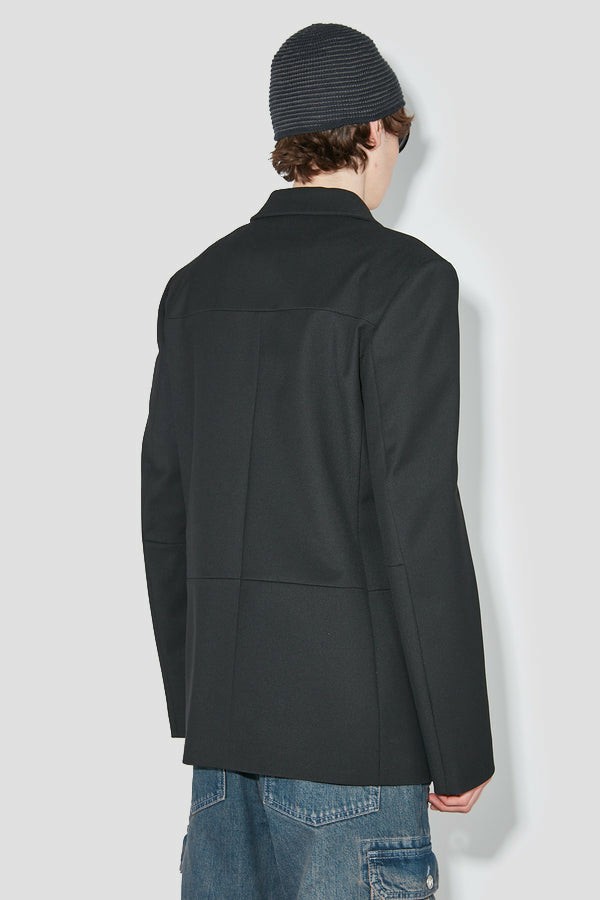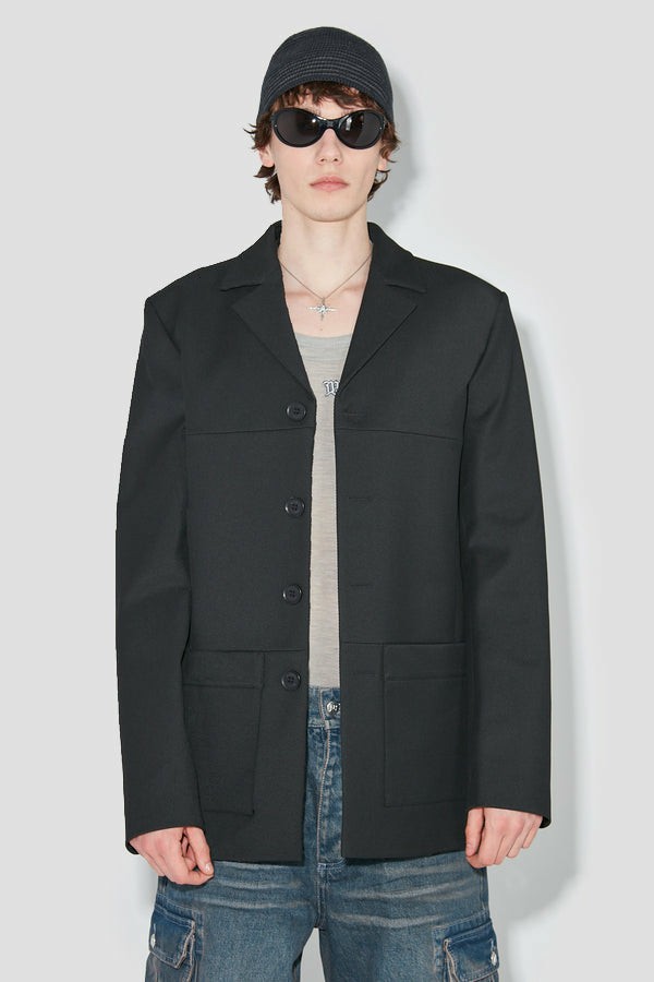 Single-breasted blazer in black. Logo button closure at front. Two patch pockets at the waist. Logo lining.