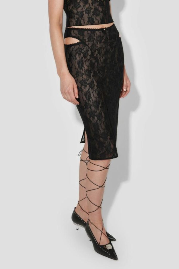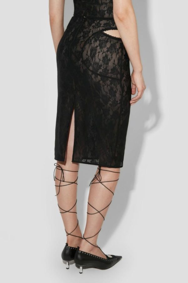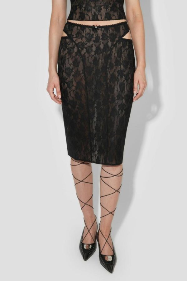 Fitted midi skirt in black. Flower print throughout.