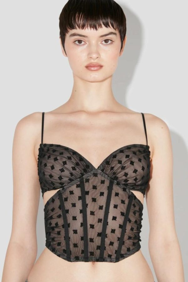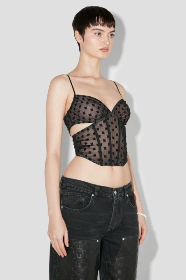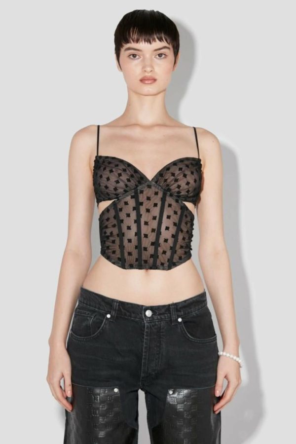 Cropped corset top with thin straps, made from soft mesh material in black. Features an all-over monogram pattern. Has ruffles and decorative slits under the bust.