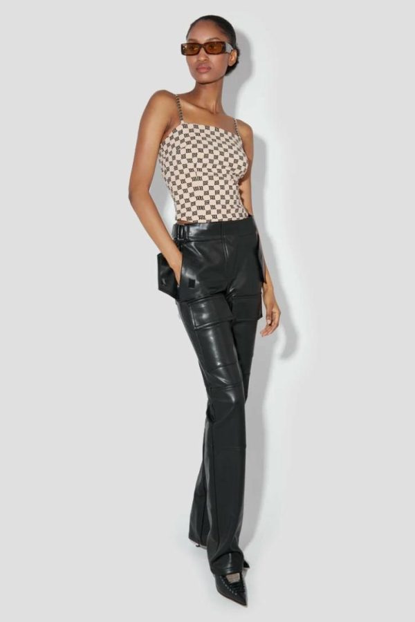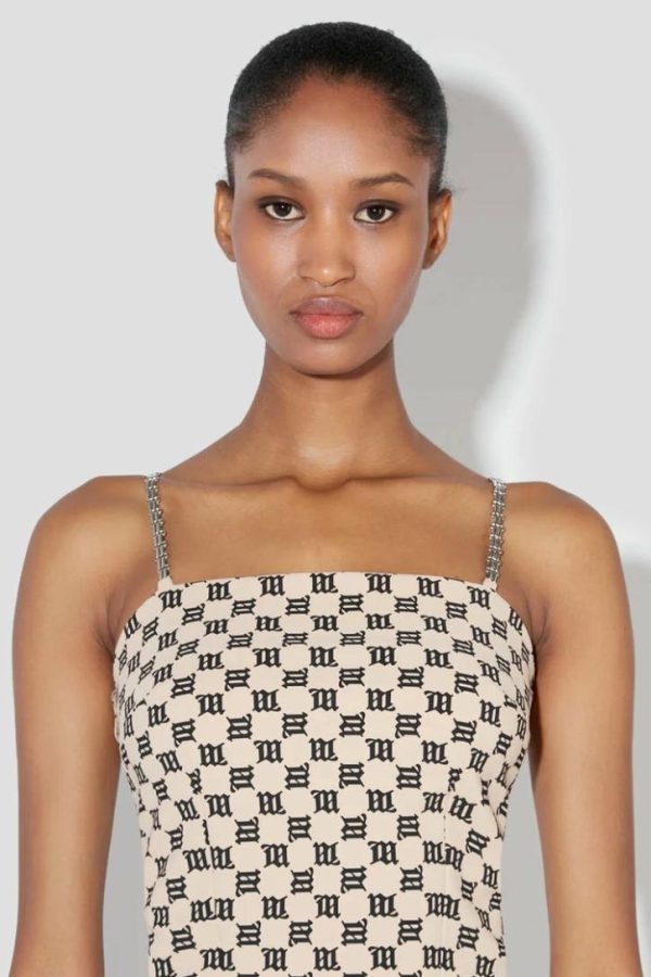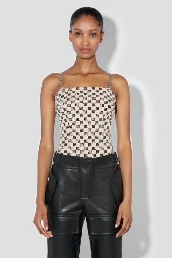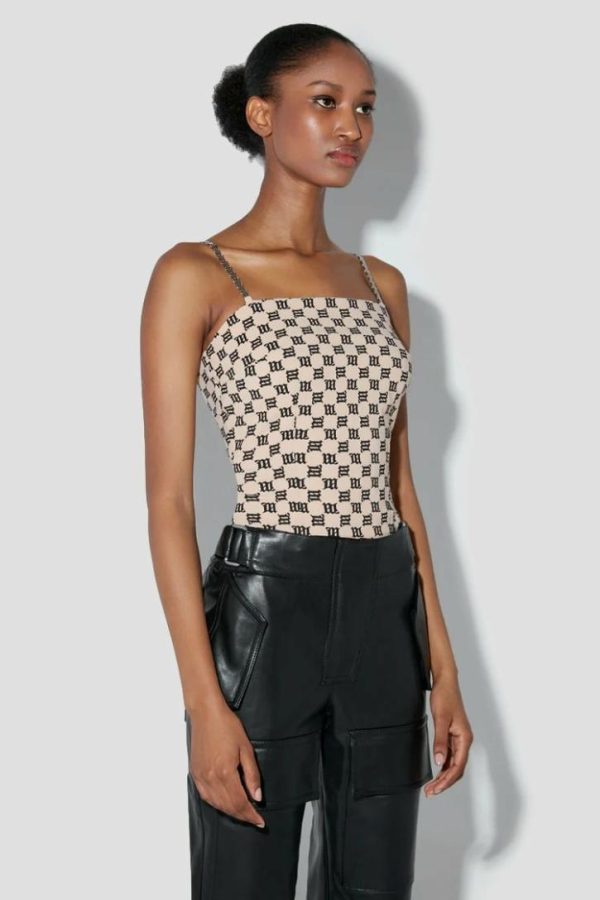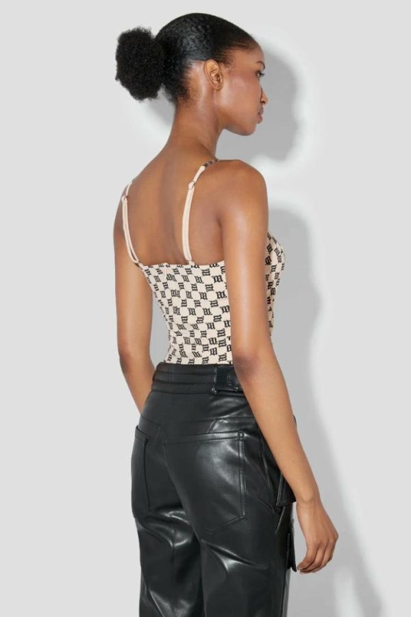 Beige top crafted from stretchy fabric. Features an all-over monogram pattern. Detachable and adjustable metal shoulder straps. Elastic lining. Fastened at the back with a zipper.
