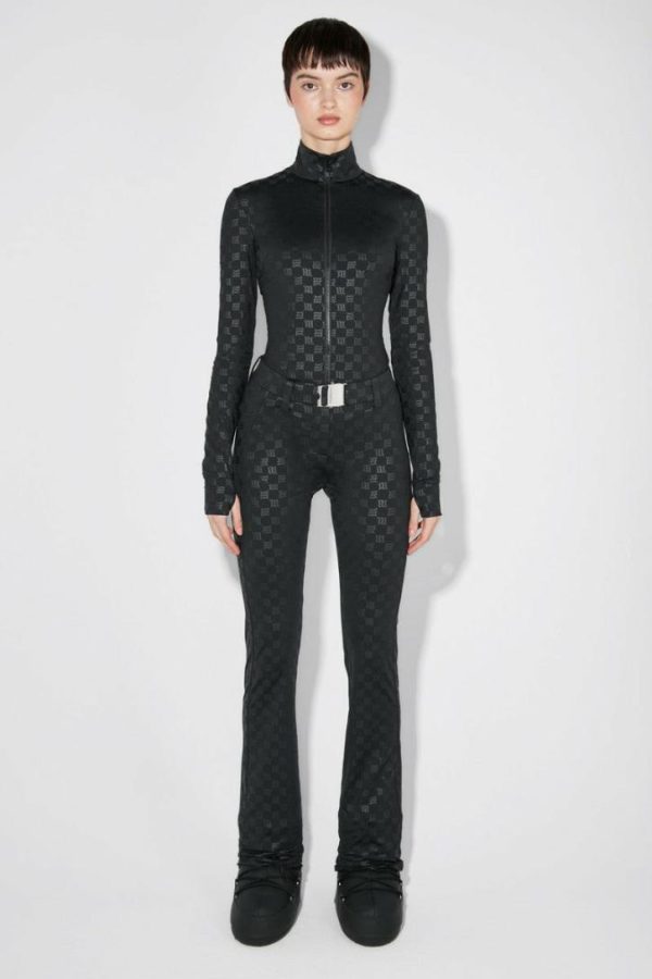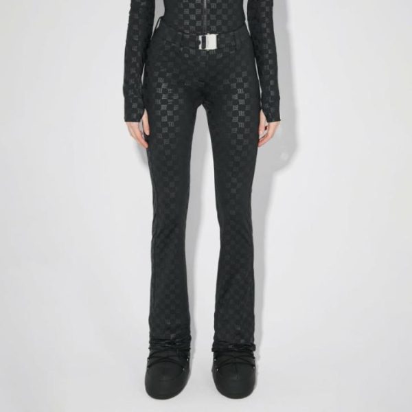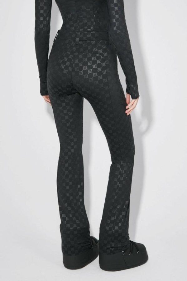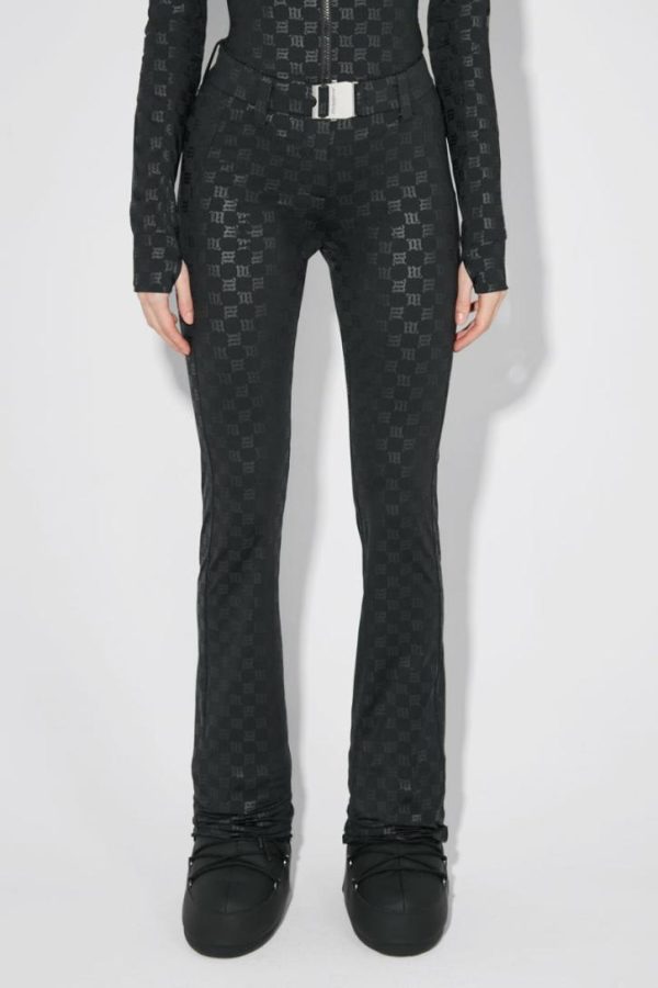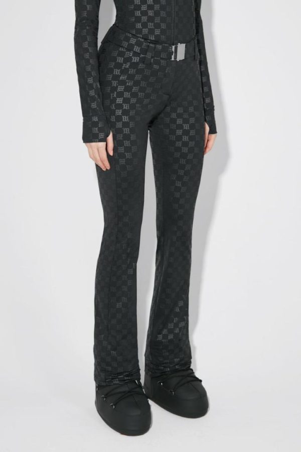 Fitted pants with flared legs are made of elastic fabric. The material is fully covered with a light-reflecting Monogram. The pants are fastened with a zip and a belt with a metal logo buckle.